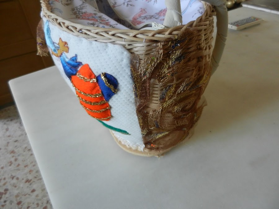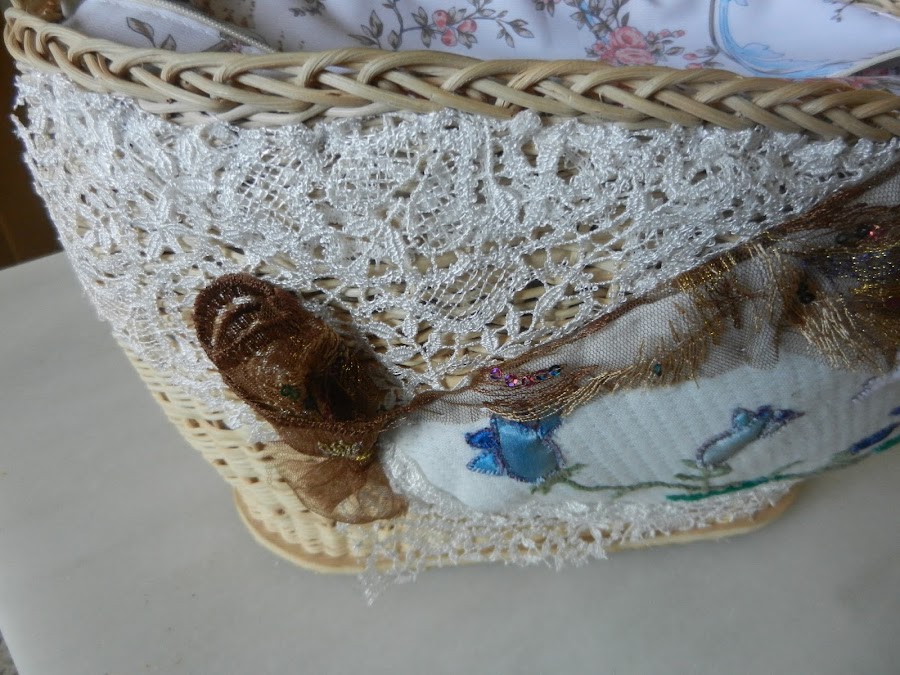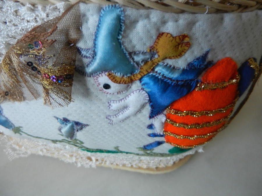 La decoración es de pasguar Un cuadro con un duende. Y telas de encaje, igual que la flor de encaje.