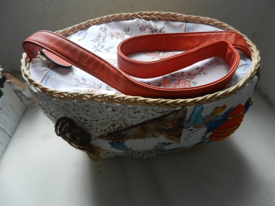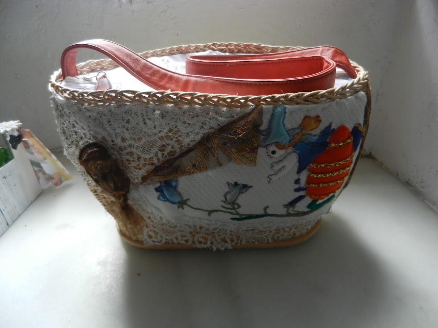 El asa y el tirador de la cremallera son de piel, naranja, reciclado de un bolso viejo.
