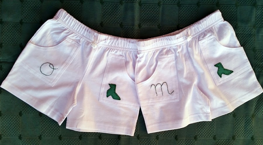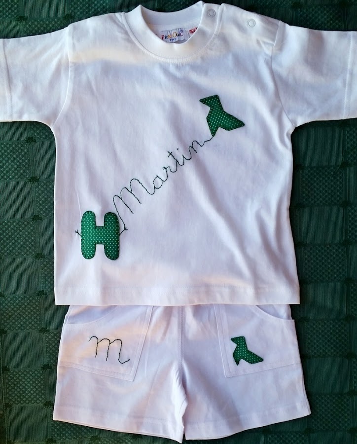 El pantaloncito es más sencillo, con una pajarita y la inicial de cada uno de los niños.