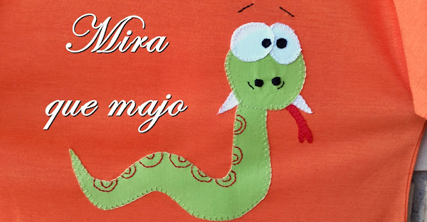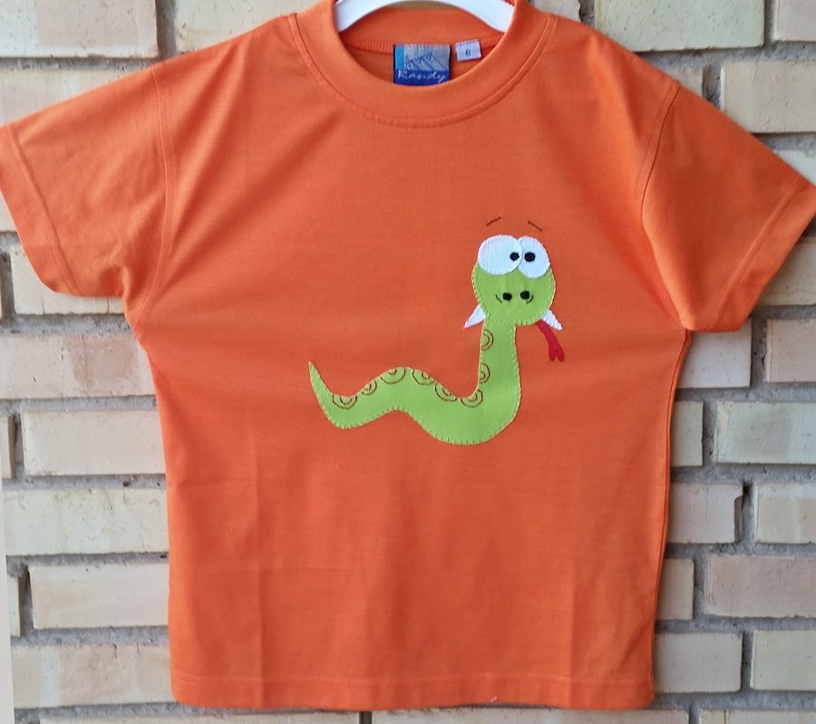 Así que esta camiseta tiene una culebra pero muy simpática, de esas que no dan ningún miedo. La hice en un tono pistacho sobre un fondo naranja, que convierten a la camiseta en muy divertida e infantil.