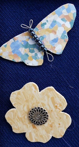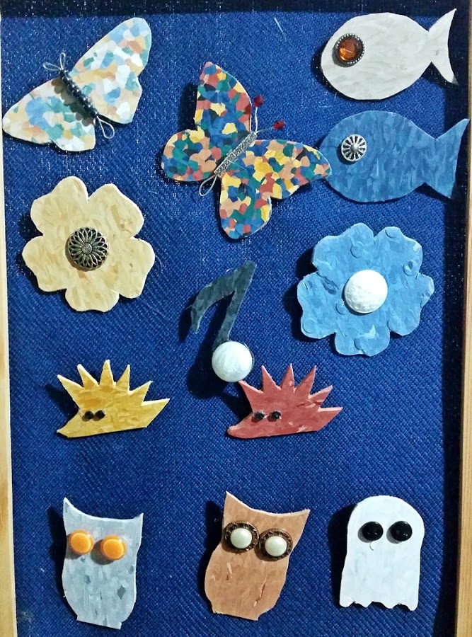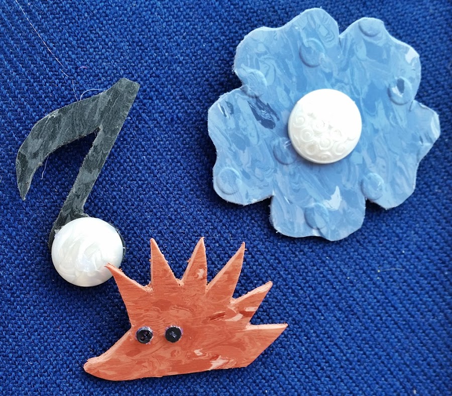 Para hacerlos ideamos con lápiz y papel en mano algunas formas que fueran muy sencillas, porque el material no nos permitía muchas complicaciones. Así que Jaime diseñó erizos, peces, flores, mariposas, fantasmas,…. que fuimos pasando al material y que con nuestras cajas de botones y abalorios fuimos adornando, pero de forma muy sencilla.