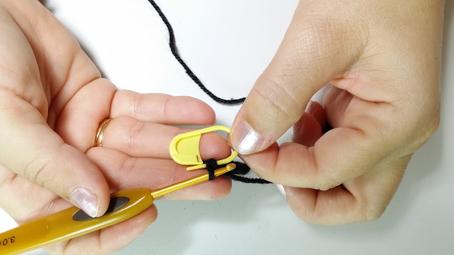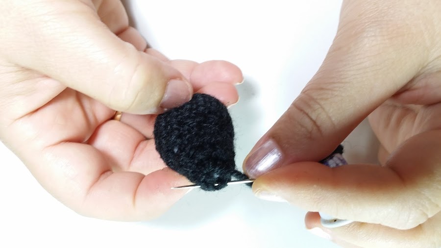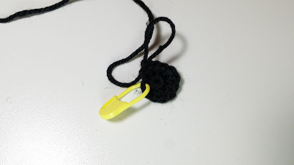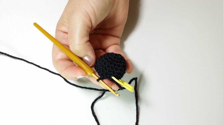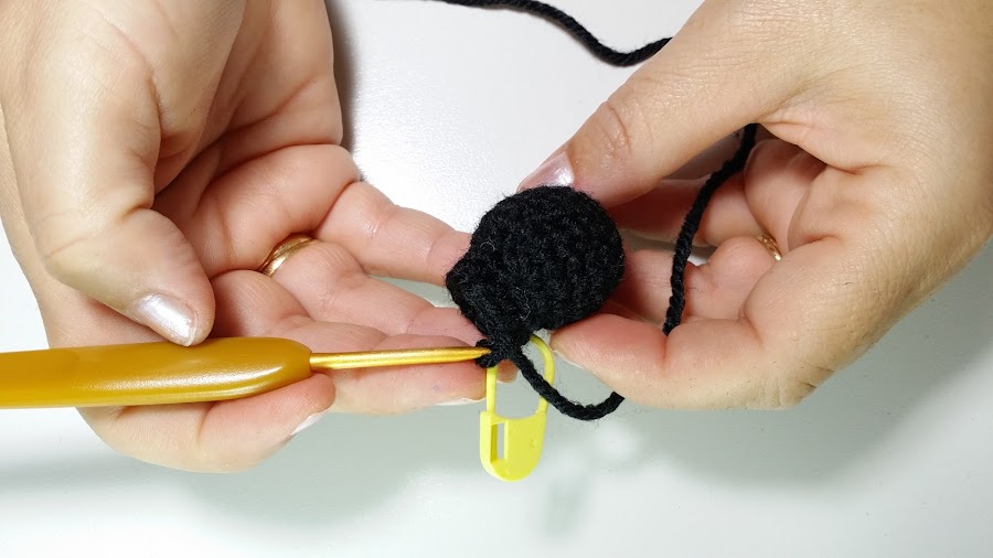 * Usando como referencia la hilera que hemos dejado señalada en la vuelta 8 con una hebra de lana de otro color, rodeamos esa vuelta con una hebra negra que apretaremos fuerte para simular la separación entre el cuerpo y la cabeza.