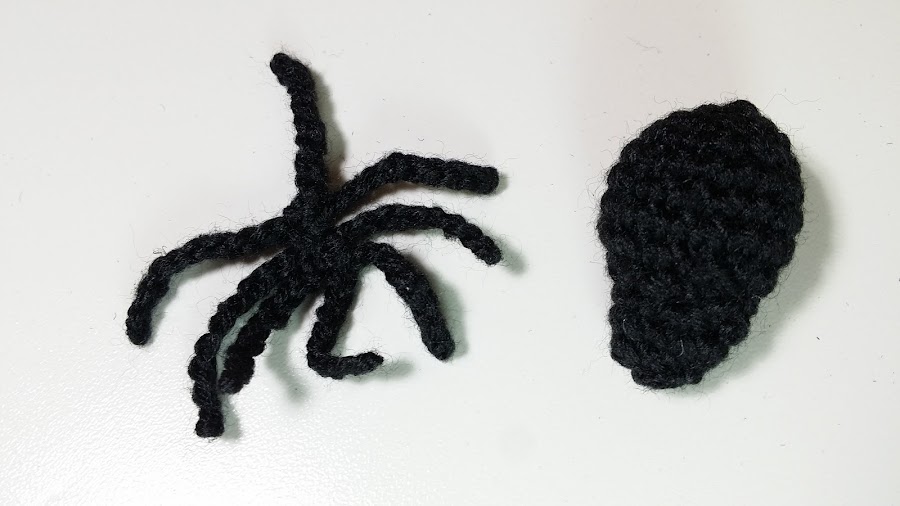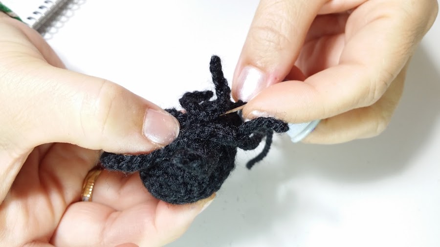 El cuerpo de la araña se empieza a tejer desde el trasero hasta la cabeza. Se tejen las hileras en espiral. Es decir, no se cierran las vueltas y nos guiaremos por un marcador que nos señalará el comienzo y final de cada una.