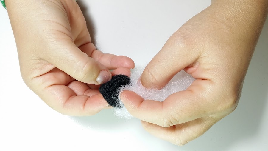 11º .- Disminuimos tejiendo todos los puntos juntos, de 2 en 2, hasta dejar 6 al final de la hilera. Terminar de rellenar y rematar cerrando con aguja lanera.