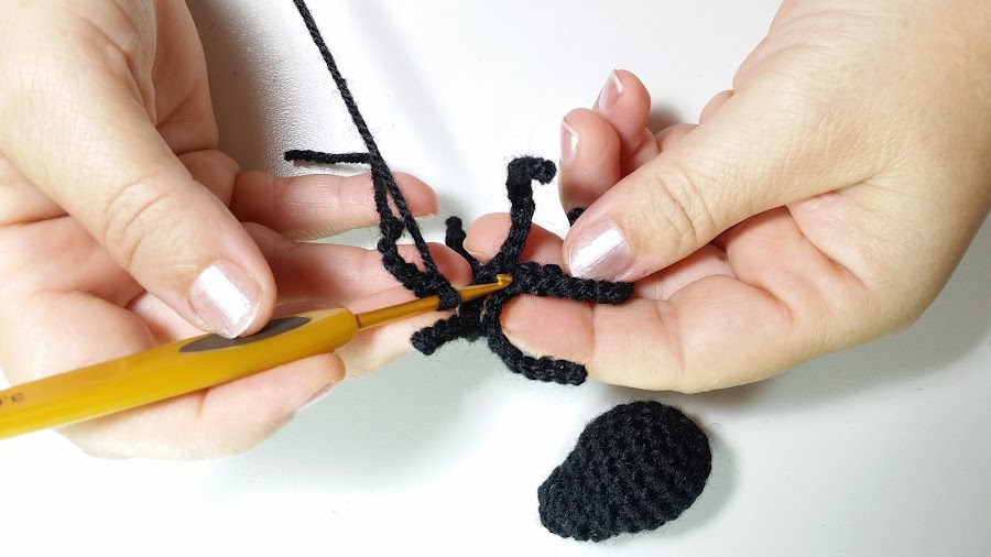 ,- Para las siguientes patas tejemos 9 cadenas uniendo con 1 punto bajo sobre el anterior y continuamos con otras 9 cadenas. Cortamos la hebra.