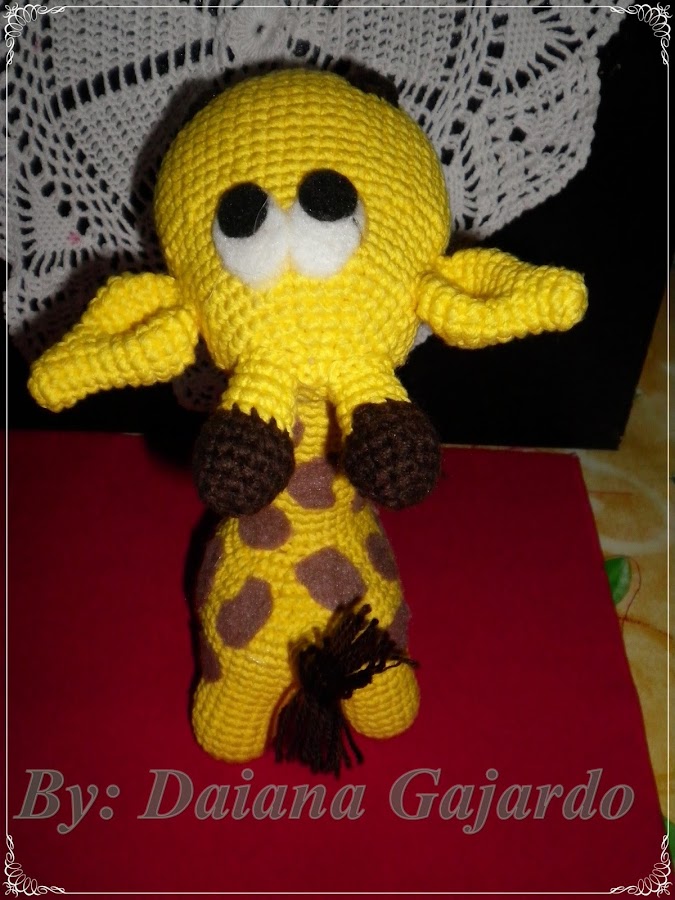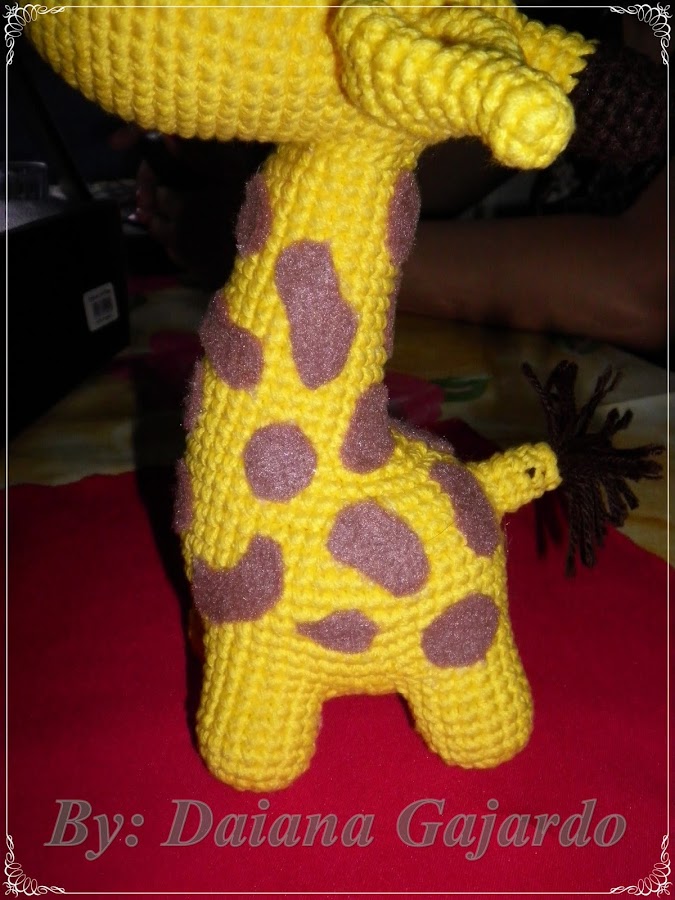 El cuerpo de esta Jirafa esta realizado de forma "entera" se tejieron las cuatro patas por separado al igual que la pancita, luego se unieron a través del ganchillo (aguja) tejiendo en rondas como se hace tradicionalmente, por este motivo no fue necesario coser las piezas, ya que como se dijo, se unieron con el tejido y desde ahí se fue tejiendo hacia arriba para seguir haciendo el cuerpito y el cuello de la jirafa.