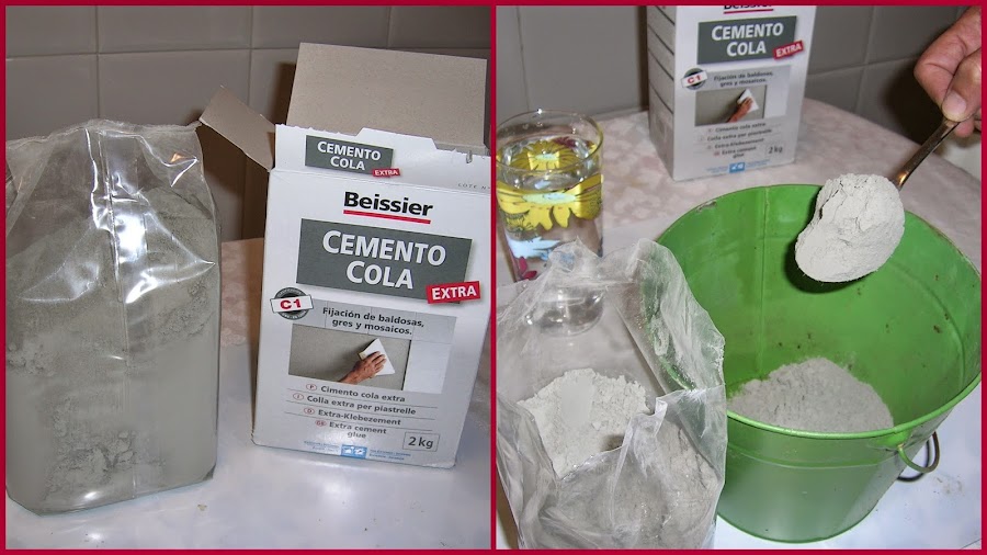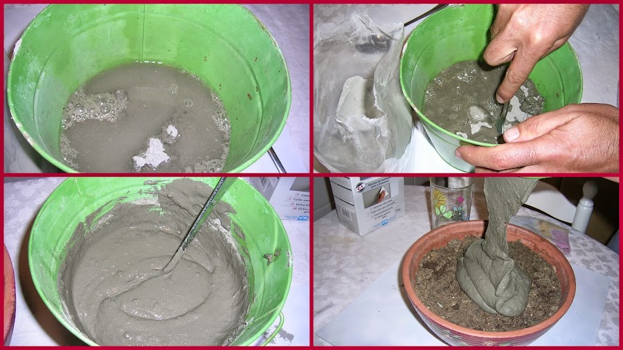Eche la proporción que ponía en las instrucciones y comenzamos a revolver...Cuando estuvo a nuestro gusto lo echamos sobre la tierra de la maceta de barro que teníamos preparada, menos un par de centímetros que era para rellenar de cemento. aquí me ayudó mi marido, que casi siempre es cómplice de estas historias!!!