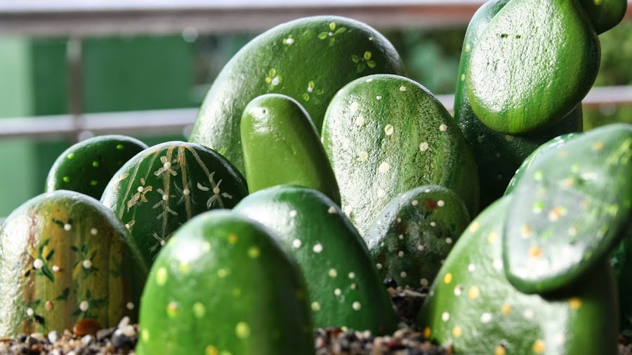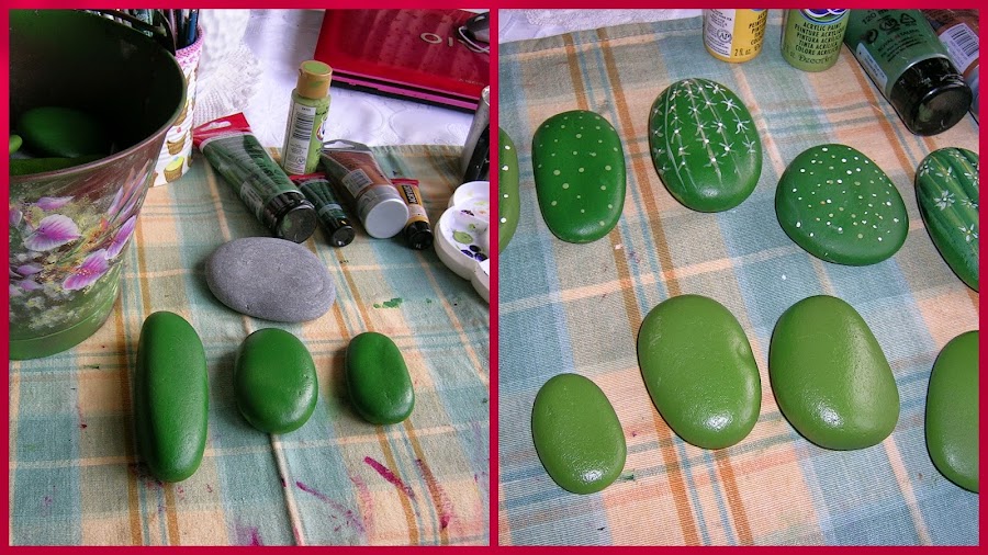 Lo primero es pintar las piedras. En la primera capa utilicé spray y después con distintos tonos de verde maticé los colores. Además el blanco, ocre y amarillo me ayudaron a hacer los dibujos.