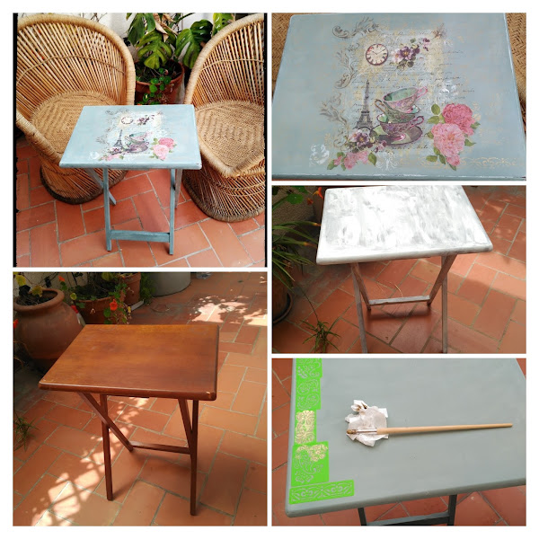 Con pintura chalk paint de base de Annie Sloan, las técnicas de decouoage y estarcido con un acabado a la cera, realicé la restauración de esta mesita auxiliar