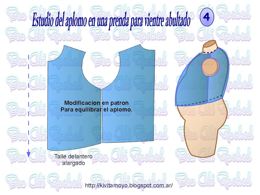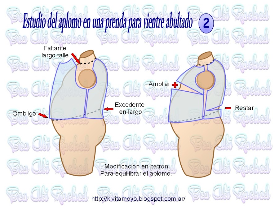 Cuando la prenda es pinzada, basta con efectuar el traslado de pinza o aplicar recortes, y alli incrementamos la falta de espacio que generaria el vientre. Pero al tratarse de una prenda sin pinzas, debemos modificar el largo de talle de otra manera.