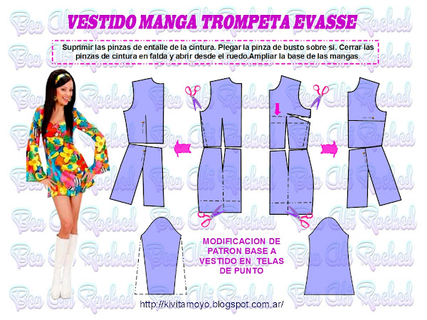 A partir del patron base de cuerpo y falda, hacer las siguientes modificaciones: suprimir las pinzas de entalle en cintura. Abrir desde la base la falda para generar el vuelo. En la delantera plegar sobre si la pinza de busto, para eliminar el excedente de largo del talle delantero. Ampliar la base de la manga.