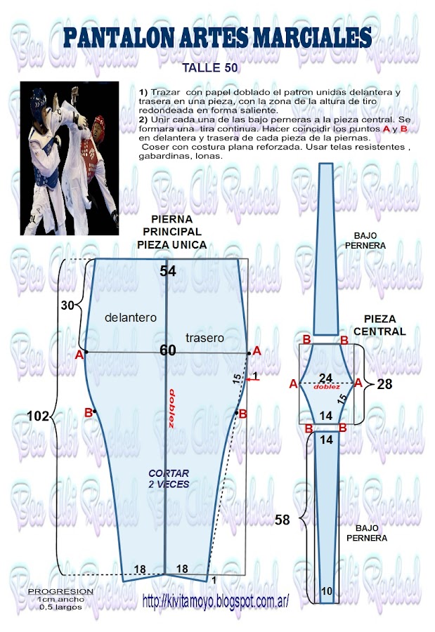 La pierna principal se corta dos veces. La pieza central se corta una vez, y el bajo pernera 2 veces. El pantalón en total consta de dos piezas que rodean cada pierna con una franja central que las une con costura reforzada, para facilitar los movimientos. Se recomienda hacer costura plana, la que se usa en los vaqueros, y usar telas resistentes.