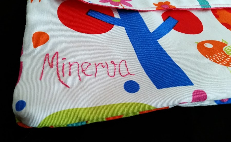 Seguro que en el cole no habrá otra bandolera como la de Minerva, pero por si acaso bordamos su nombre para que no hubiera ninguna duda.