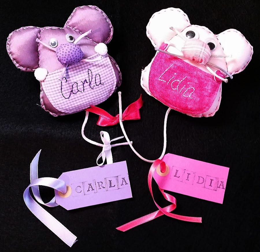 Hace poco se puso en contacto conmigo para pedirme que le hiciera unos ratones para que sus sobrinas dejaran los dientes al ratoncito Pérez, pero los quería personalizados con el nombre de cada una de ellas. Así que eso fue lo que hicimos, bordamos Carla y Lidia en los ratones de los colores que me había pedido y quedaron geniales.