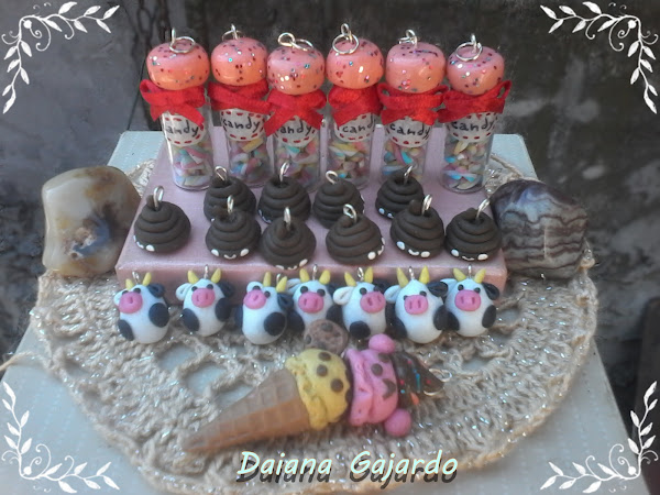 En la foto se ve el heladito Kawaii, Vaquitas, poop kawaii y frasquitos candy con malvaviscos de porcelana fria en su interiror :) todos son dijes para colgante n_n