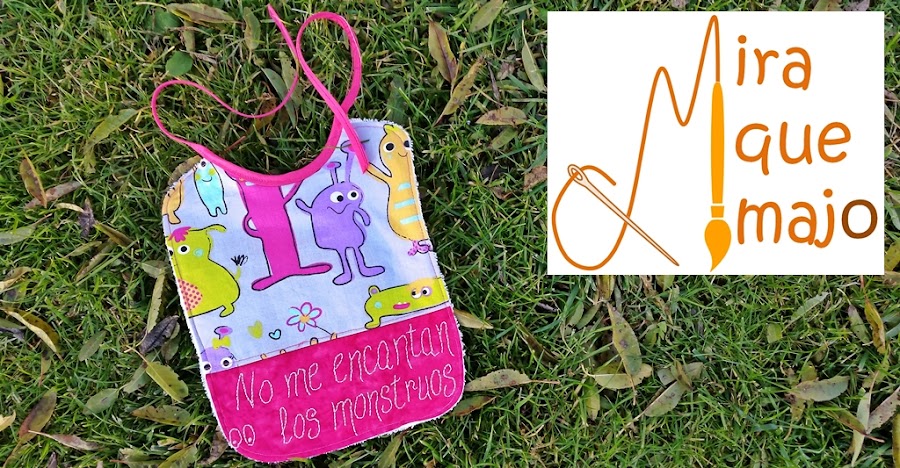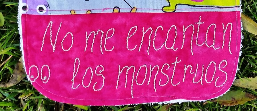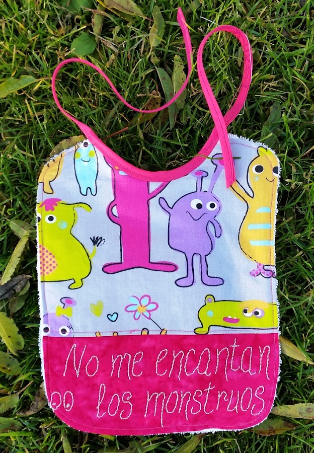 A esta curiosa expresión le he dado vueltas para idear varios trabajos y hoy os enseño uno de ellos, un babero con una tela muy divertida de monstruos y en la que he bordado la frase de la pequeña Dácil.