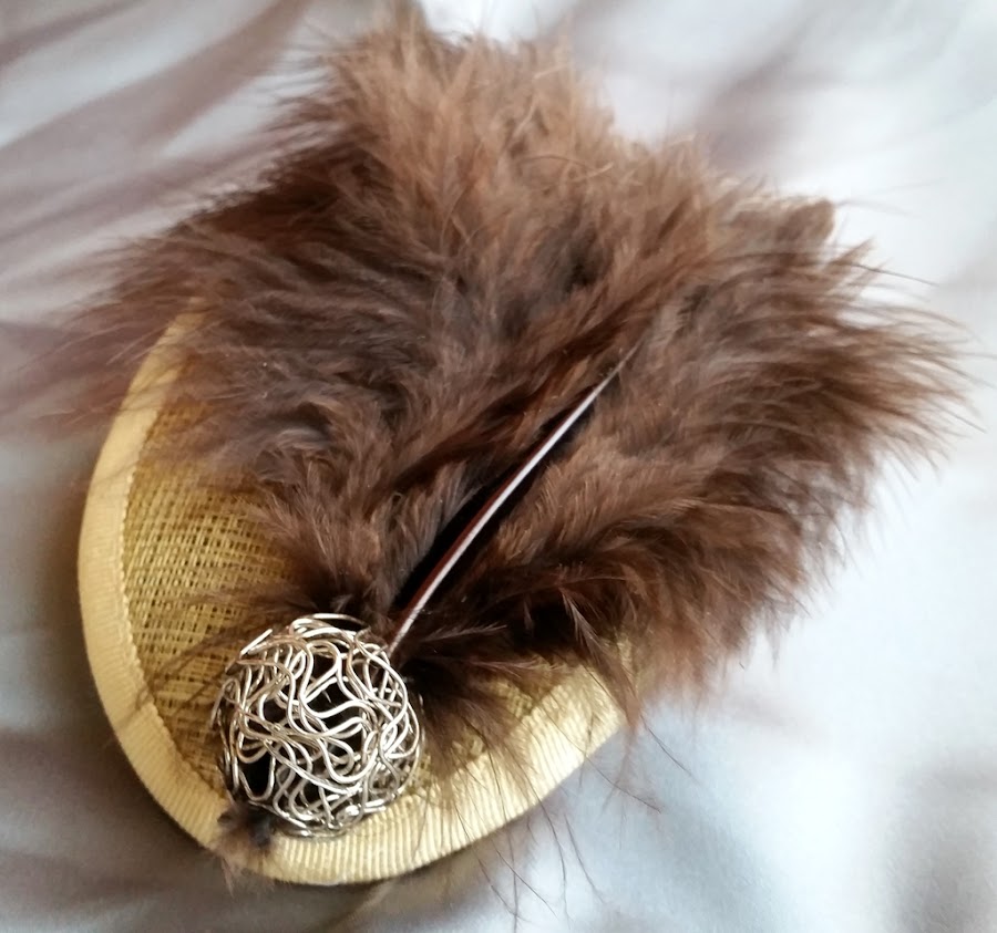 Hoy os enseñamos un tocado muy sencillito pero elegante. Se trata de una base de rafia en tono natural en el que hemos puesto unas plumas marrones unidas con un abalorio dorado de filigrana que le da un toque elegante.