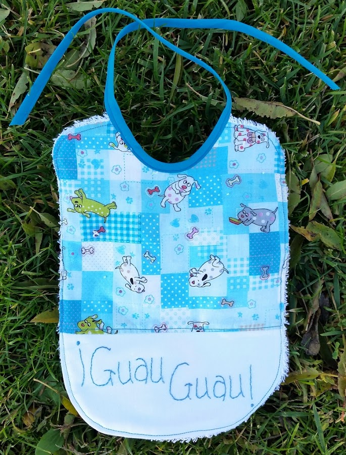 La tela de hoy ya la habíamos utilizado en otros trabajos, pero hoy os enseñamos un babero muy simpático en el que hemos bordado unos ladridos perrunosya que es una tela en la que aparecen pequeños perritos.