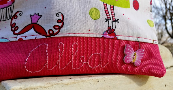 Ese estampado tan simpático y colorido los combinamos con una tela en fucsia en la que bordamos su nombre para que no hubiera duda de para quién era.