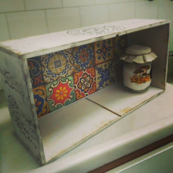Caja de vino convertida en estanteria para la cocina