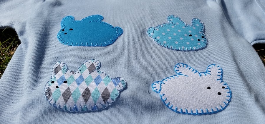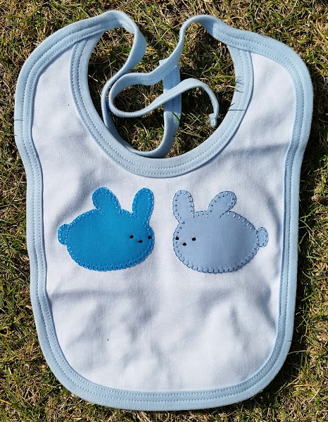 Se trata de un body y un babero que hemos decorado con unos conejitos muy dulces en diferentes estampados azules. El body con cuatro chiquititos y el babero con dos un poco más grandes.