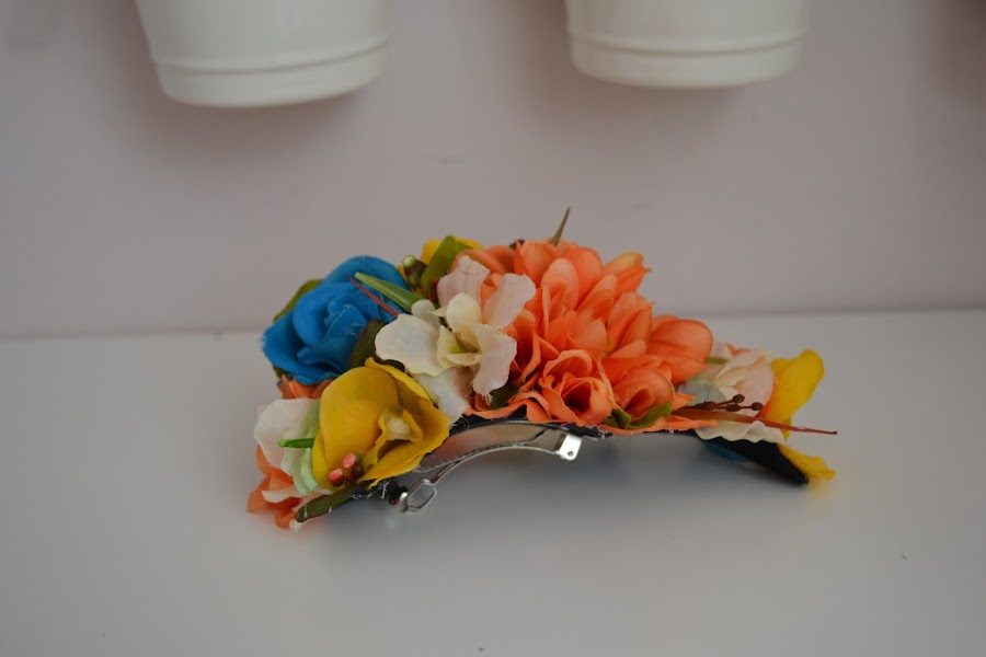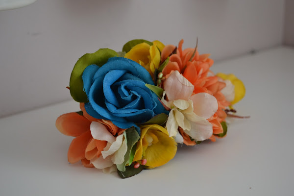 Utilice flores en tonos azules, naranjas, amarillos y tostados. Todo a juego con su preciosa falda.