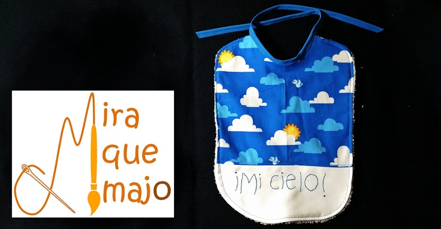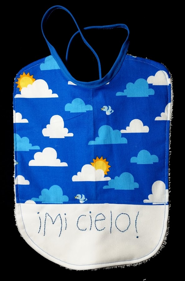 Ya sabéis que me encanta hacer baberos con telas divertidas y con un mensajito bordado. La de hoy es una tela de nubes que ha tenido mucho éxito, ya que es un motivo que siempre da un toque dulce y tierno.