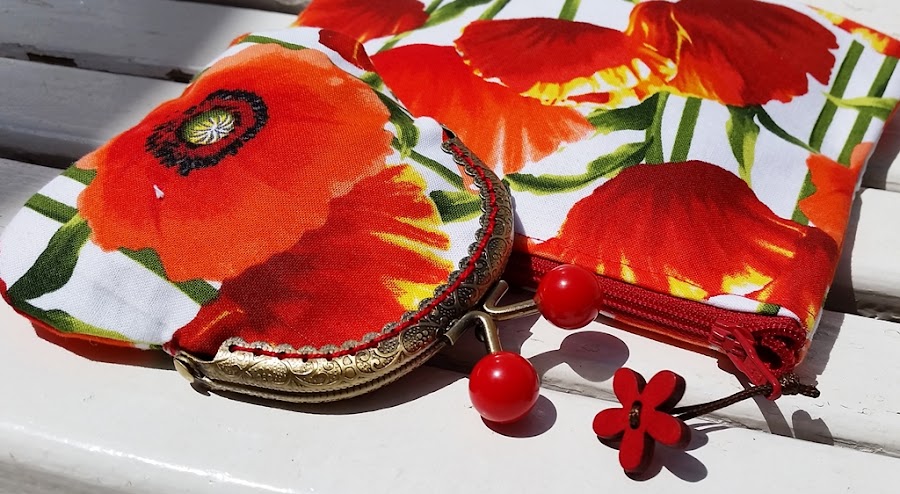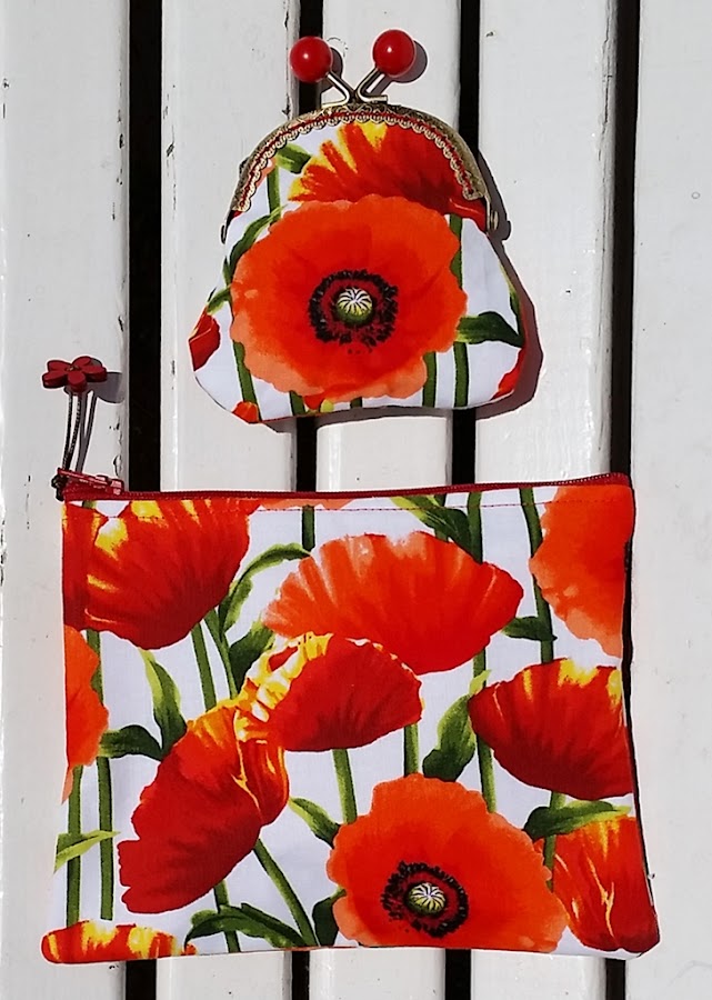 Pues el trabajo de hoy va dedicado a esta flor. La base es una tela preciosa que me regalaron, con amapolas en distintos tonos de rojo y con la que he hecho un monedero de boquilla de bolas rojas y un pequeño neceser para llevar bien ordenaditas todas las cosas.