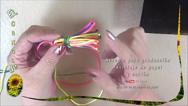con la tapa de una caja de zapatos envolvemos de esta manera cinco veces, cortamos y amarramos, sacamos la tapa y volvemos a amarrar, acomodamos y amarramos en el fondo de la base, en la caja del birrete ponemos dulces o lo que queramos regalar junto con el arreglo.