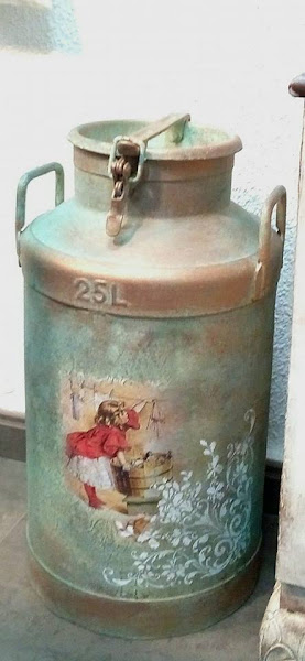 Una lechera trabajada con chalk Paint y acrílicos dorados, cobre, salpicado.. con los que conseguimos un efecto de oxidado.
