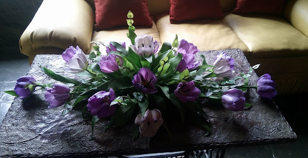 This is a centerpiece made with tulips in different shades of purple, with some light effects provided by white tulips. If you want to see more pics, click here: