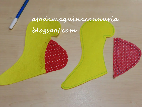 Cuando hayas cosido el muñeco y le vayas a dar la vuelta las piernas te han de quedar por el derecho por eso es importante que coloques las piernas en la posición de las marcas que has hecho, por el derecho del fieltro y mirando hacia el interior. es lo mismo que te he explicado para las cretas. Fíjate en la foto y lo verás muy claro.