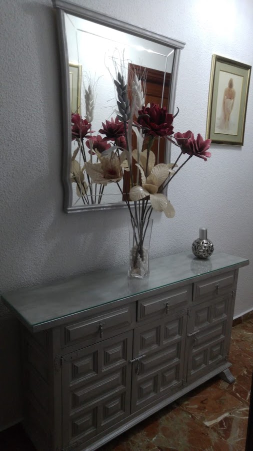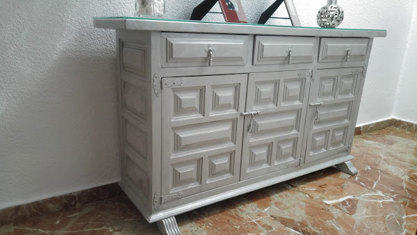 Una vez seco con pintura agua plateada y una esponja la he matizado por algunos sitios , he de destacar que los herrajes no los he quitado , todo a la vez lo he pintado , y han quedado genial! Una vez acabado el trabajo se ha barnizado dos manos de barniz al agua incoloro mate.