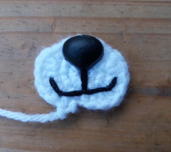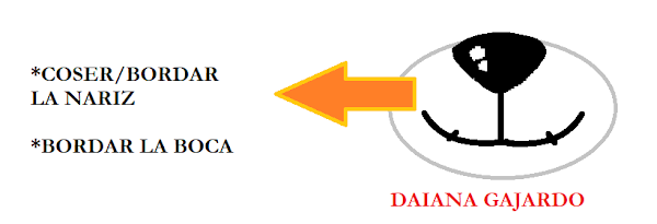 POR ULTIMO LE BORDAMOS UNA LINEA NEGRA DE LA NARIZ HASTA UN POCO MÁS ARRIBA DE LOS OJOS Y PEGAMOS UN PEDACITO DE FIELTRO/PAÑOLENCI ROSA SOBRE LOS COSTADOS PARA SIMULAR MEJILLAS ROJAS, EN CASO DE NO TENER FIELTRO/PAÑOLENCI SE PUEDEN BORDAR CON HILO ROSA (VER FOTOS