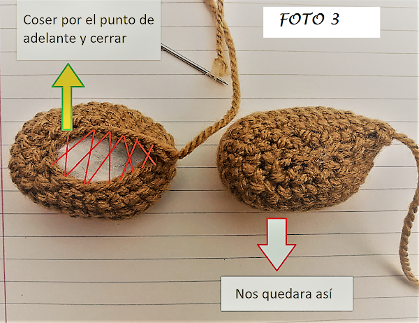 RELLENAR CON VELLÓN Y CERRAR POR EL BORDE (VER FOTO 3) DEJAR HEBRA LARGA PARA COSER
