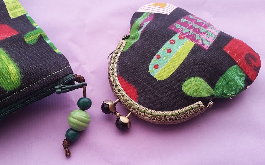 Hoy os enseño un conjunto muy chulo de neceser y monedero de boquilla, confeccionados con una tela de cactus (que están súper de moda) combinada con verde.