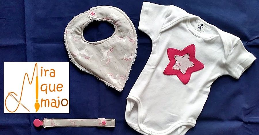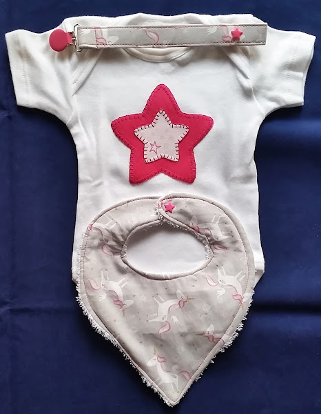 Se trata de un body, en el que hemos aplicado una estrella combinando dos telas, y una tira de chupete y una bandana hechas con tela de unicornios.