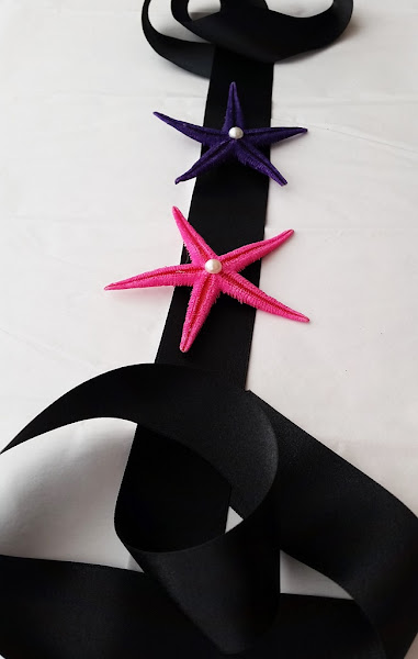 Hoy os enseño uno de los cinturones que hemos hecho en Mira que Majo, se trata de un complemento que esta montado sobre una cinta de raso negro y en la que hemos puesto unas estrellas de mar teñidas , una en fucsia y otra en morado, y una perla en el centro de cada estrella.