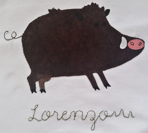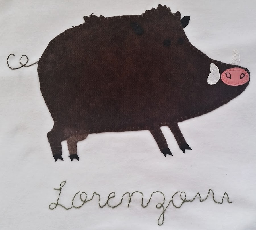La pieza ya la veis, un simpático jabalí aplicadoy el nombre del pequeño sobre el que camina el animal. Espero que os guste y si tenéis alguna idea para una camiseta, os podéisponer en contacto con nosotros y os haremos una “MUY MAJA”