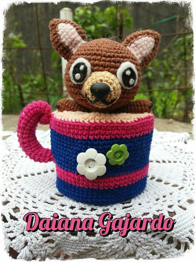 Hola mis queridos amigos/así como están? yo feliz de mostrarles uno de mis amigurimis que tengo pendientes desde hace muchos años , este simpático Chihuahua en taza que ya teji hace un tiempo atrás