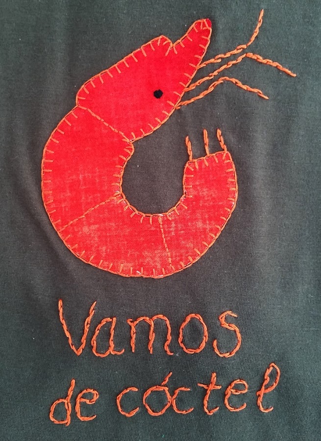 Empezamos la temporada de camisetas de manga corta con esta tan divertida, donde hemos hecho una broma aplicando una gamba y bordando una invitación que no podrás rechazar:“Vamos de cóctel”.