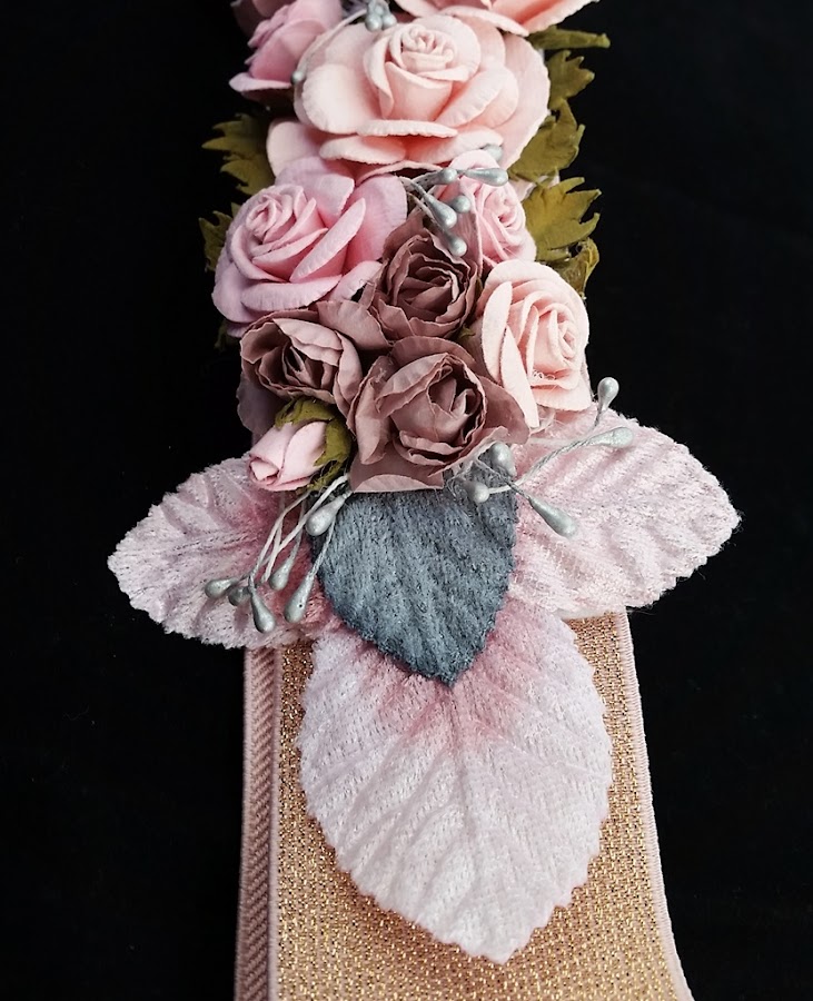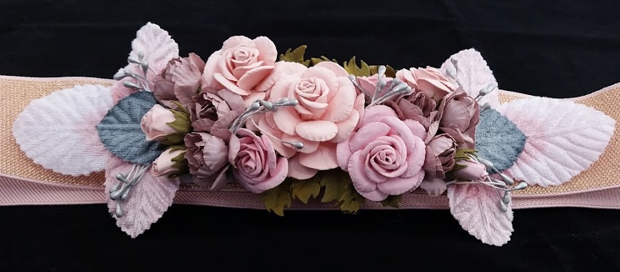 Este año los complementos de flores están muy de moda para adornar cualquier ropa, yel mío fue en tonos rosas claritos y está pegado sobre una goma tambiénen rosa, ya que el resto de los complementos tambiéneran en ese color.