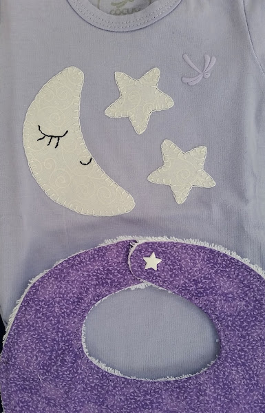 He escogido el color lila, que no es muy habitual en bebés pero que queda chulisimo. En el body he bordado una luna dormilona y unas estrellitas en una tela blanca. Y a juego con el body, una bandana también en tonos lilas y como snap, para cerrarlo, una estrellita blanca como las del body.