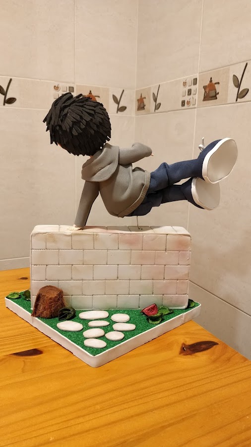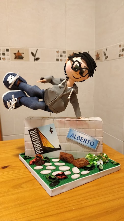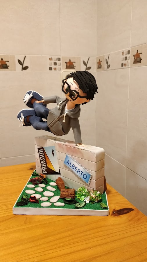 Lo más importante en un proyecto personalizado es captar la esencia de la persona que lo va a recibir. En este caso, cuando me han hecho el encargo me dijeron que el practica el Parkour, y creo que la mejor forma de que se vea reflejado, además de reflejar su peinado, sus gafas o su forma de vestir, es que se le vea practicando su deporte. Por eso, esta detenido en un salto a un muro en cualquier parque de la ciudad.