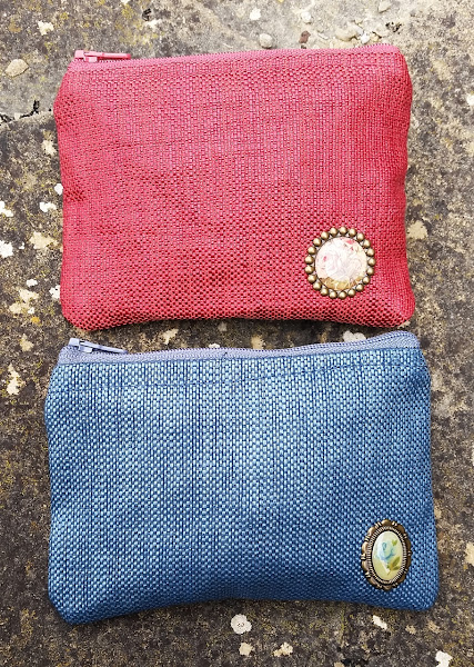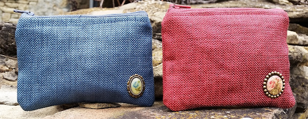 Están hechos con una tela gruesa,como de tapicería,y con un poco de brillo en dos colores, que también son originales, azul y color caldero. Como único adorno he añadidounos broches antiguos en los tonos de la tela, que les dan un toque elegante.