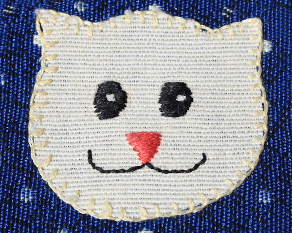 Se trata de un pieza realizada en una tela azul y con una boquilla que tiene las bolas del mismo azul que la tela, en el que además hemos aplicado la cara de un gatito.