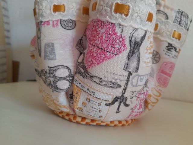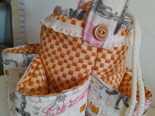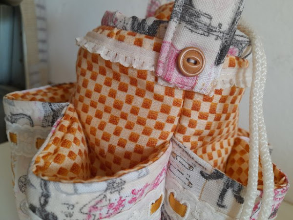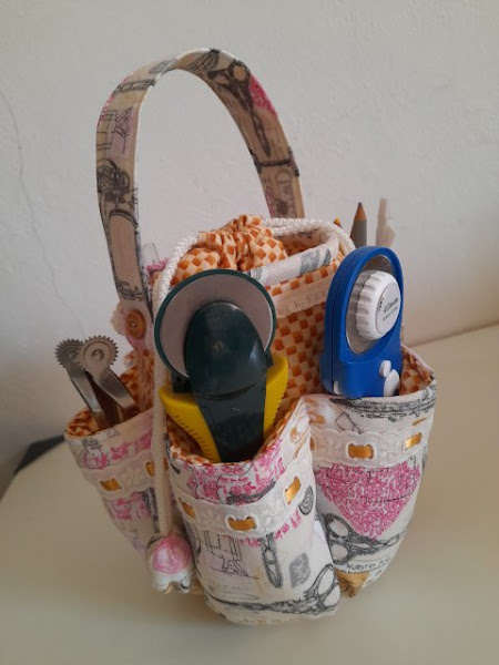 Charán! Y helo ahí, un organizador de costura que aunque no es muy grande se aprovechan muy bien los seis bolsillos en los costados mas el espacio del centro, no he decidido aún que guardaré en él pero para la foto les muestro como quedan algunos utensilios de patch: