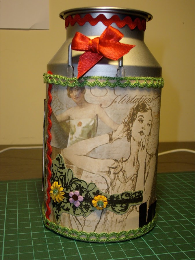 El lunes me dediqué a decorar una lechera en las que vienen bombones (lindt). Para la decoración he usado ondulina roja, puntilla de ganchillo verde, sellos de tim holtz, cinta de raso, brillantitos, cartulina, flores, chipboards...