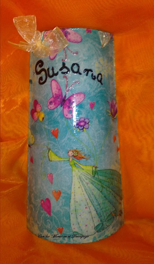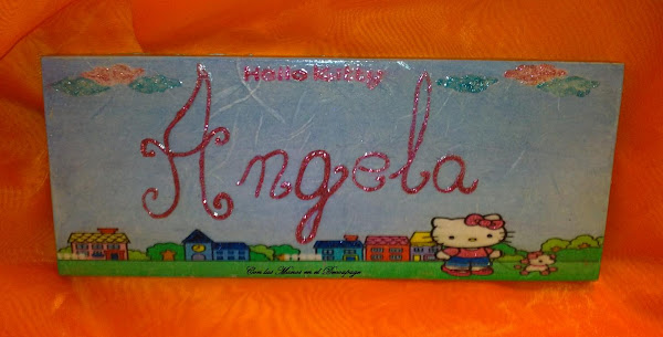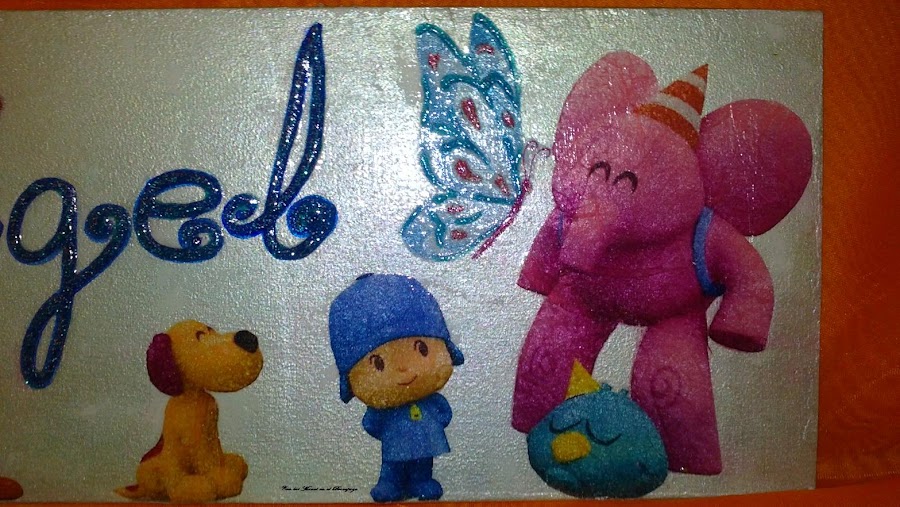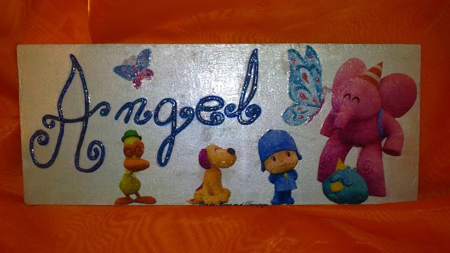 Os voy a presentar unos carteles para puertas y unas tejas, en este caso son con motivos infantiles. Los carteles estan realizados con papel de arroz impreso y las tejas con servilleta. Los nombres están realizados con gliter. Espero que os guste.