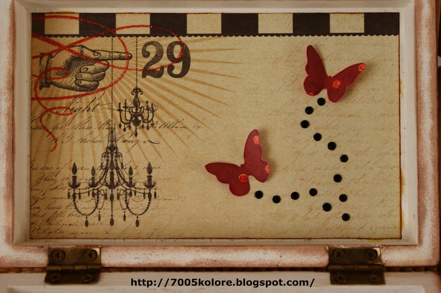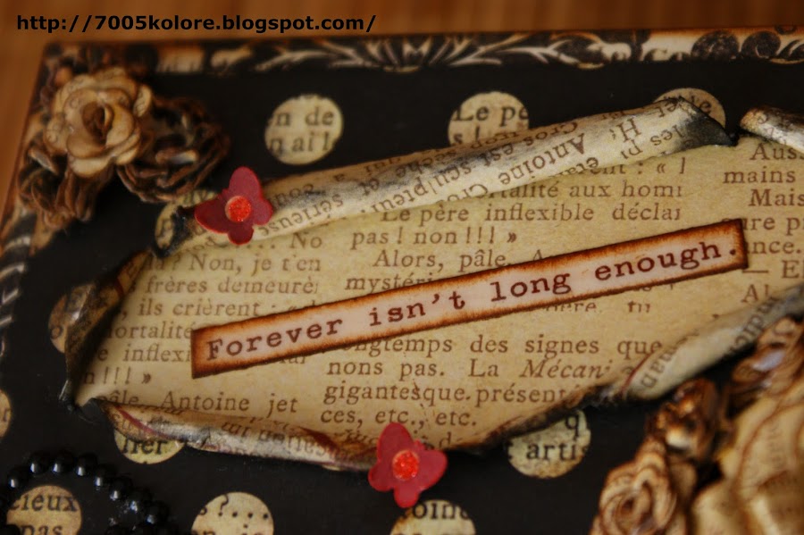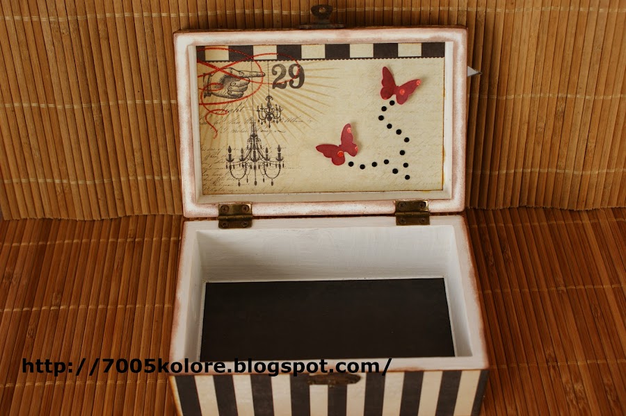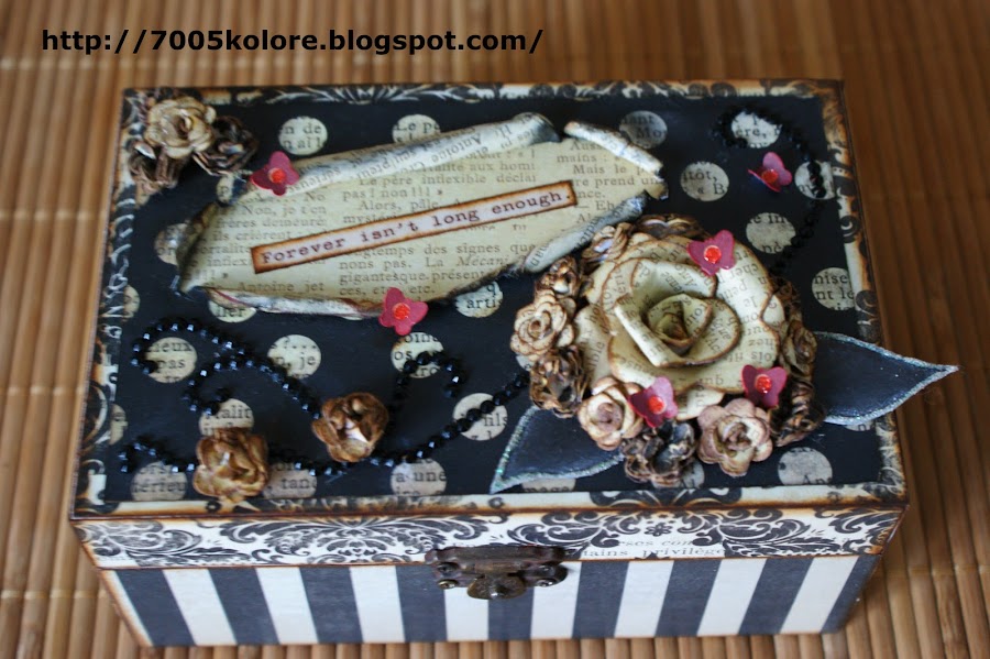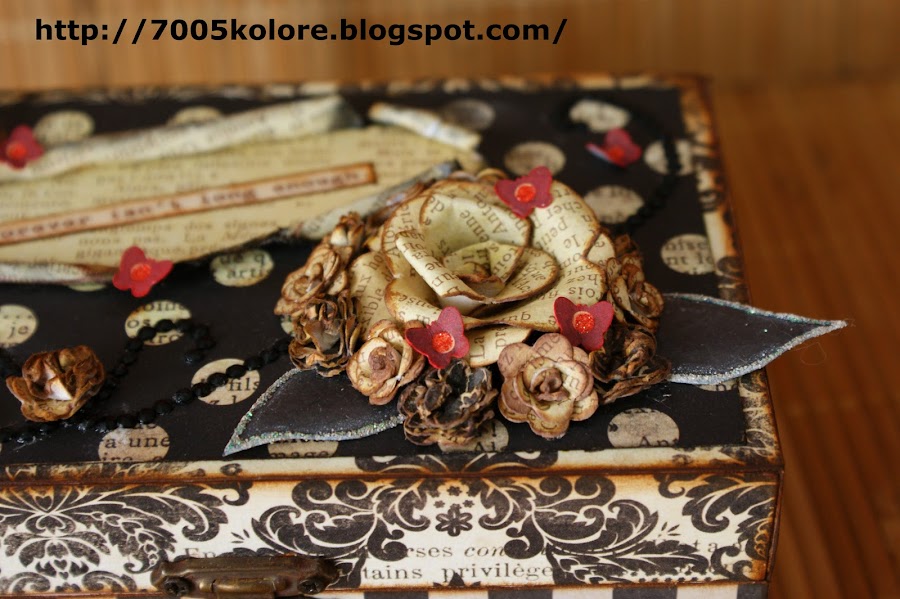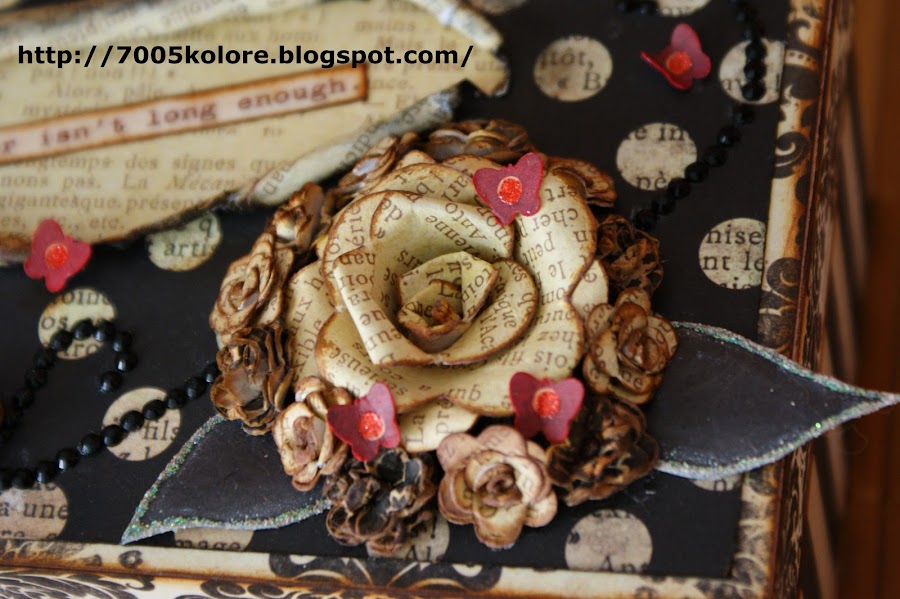 Para este trabajo he utilizado papeles de My Mind"s Eye de la colección Union Square, preciosos, que compré este verano en Barcelona. He utilizado una caja de madera a la que le he aplicado un tapaporos y después pintura acrílica blanca. La tapa lleva una jartá de florecillas, que desde que Rafi me enseñó a hacerlas no hay trabajo en las que no incluya alguna hecha por mí. El mensaje de la tapa es un recorte de un papel de Cosmocriket, de la colección Odds and Ends, un papel lleno de mensajes muy bonitos. La rosa grande lleva dos hojas que a falta de material para embossar, me he apañado con un embossado casero a base de un perfilado de Glossy por toda la hoja a la que le añadí purpurina y deje secar. Para romper con los tonos negro y blanco sucio-vintage he añadido unas mariposillas rojas de papel de la misma colección de My Mind"s Eye.